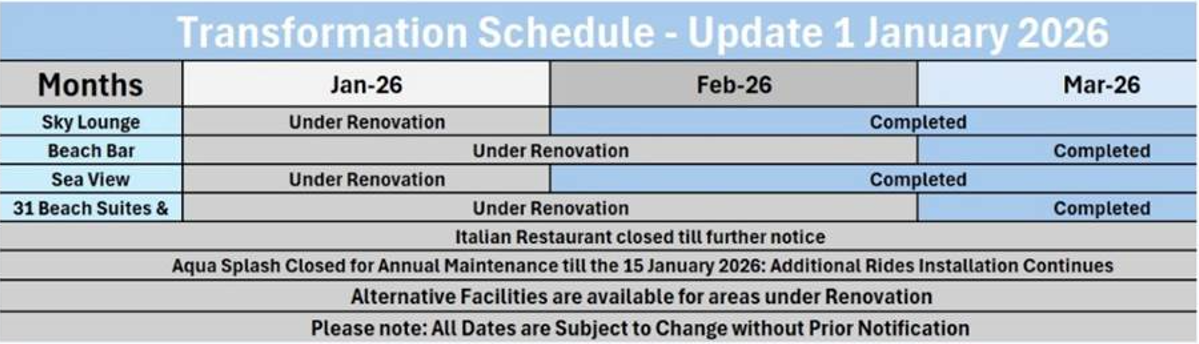 Назар аударыңыз! Қайта құру бағдарламасы 2023 жылдың 1 желтоқсанында басталып, 2026 жылдың наурыз айында аяқталады.ы. Бұл ауқымды жоба қонақтарға қызмет көрсету сапасын жақсартуға және арттыруға бағытталған (жаңарту жоспарының күнтізбесі).