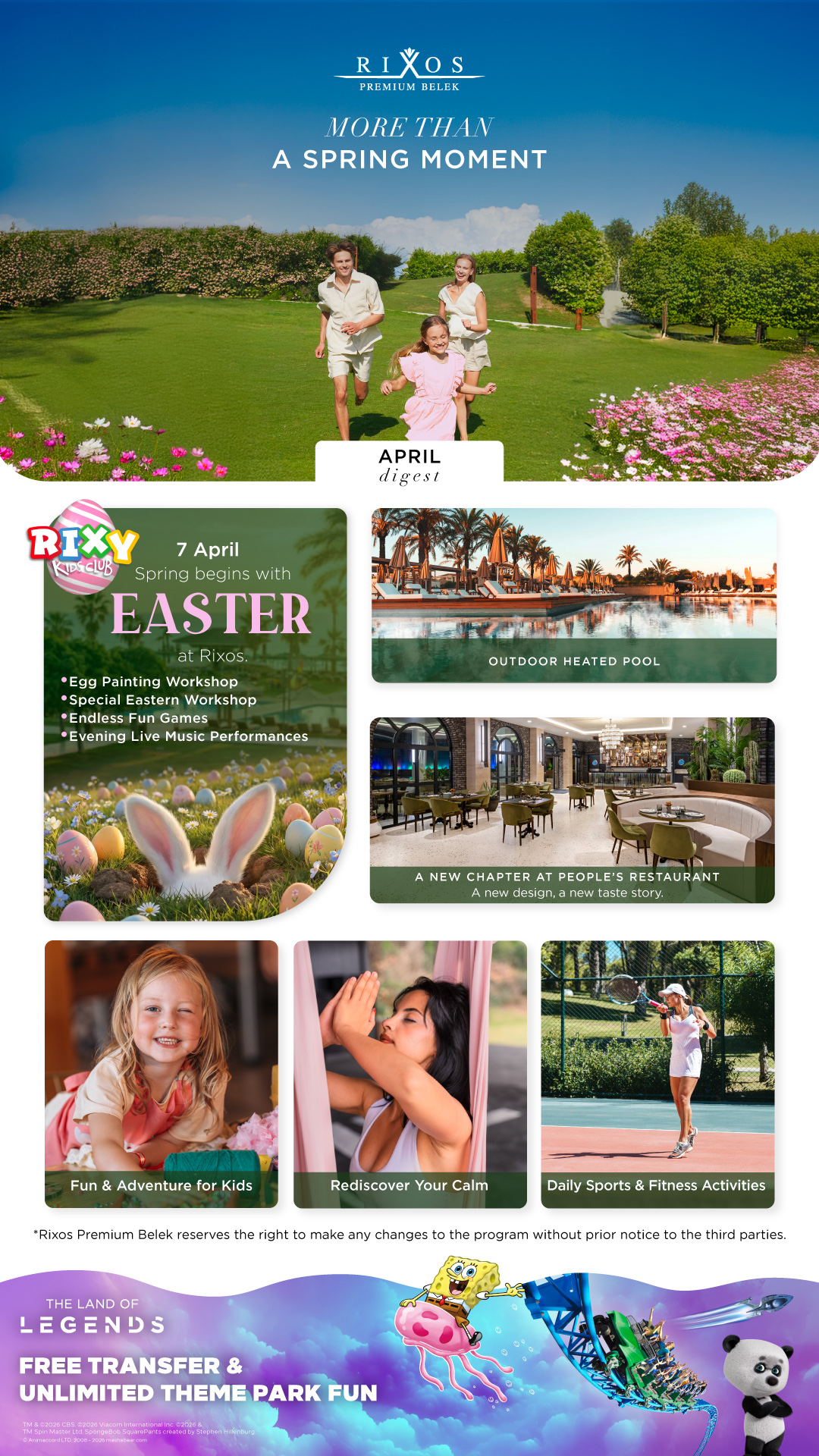 - Rixy жаңа жазғы шағын клубының ашылуы , толық жөндеуден өткен және жас қонақтардың толық жайлылығы мен қуанышы үшін жасалған (жасөспірімдерге арналған жеке аймақ, оның ішінде жасөспірімдерге арналған бар, бильярд үстелдері, үстел футболы, PlayStation бөлмелері, үстел теннисі). Барлық жастағы балаларға арналған жарқын және бай бағдарлама.