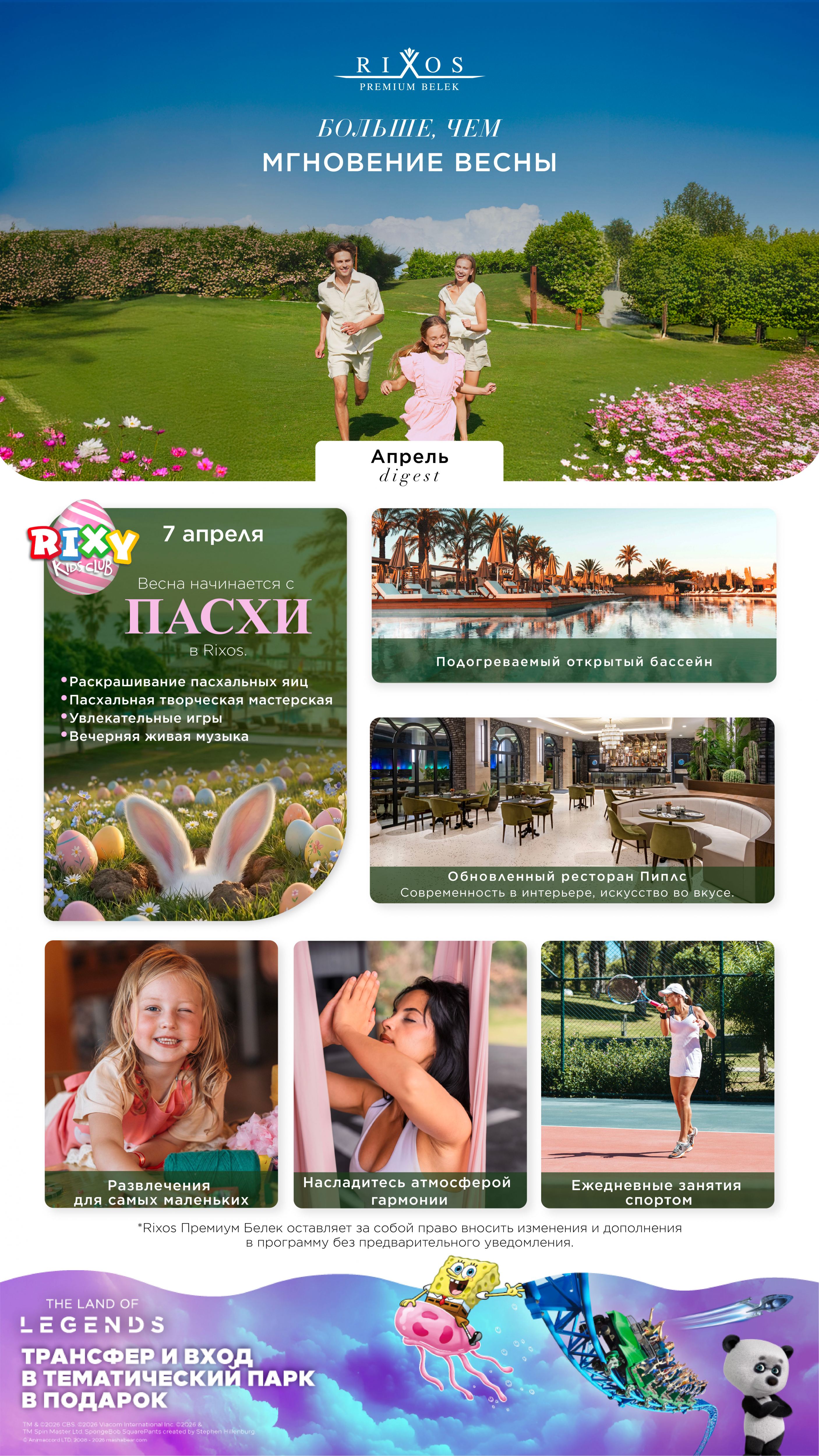 - 4 жастан 16 жасқа дейінгі балаларға арналған жаңартылған жазғы «Rixy» шағын клубы (робот студиясы, арт-студия, спорт академиясы (балалар TRX, фитнес-секіру, жекпе-жек, футбол, теннис және жүзу сабақтары)