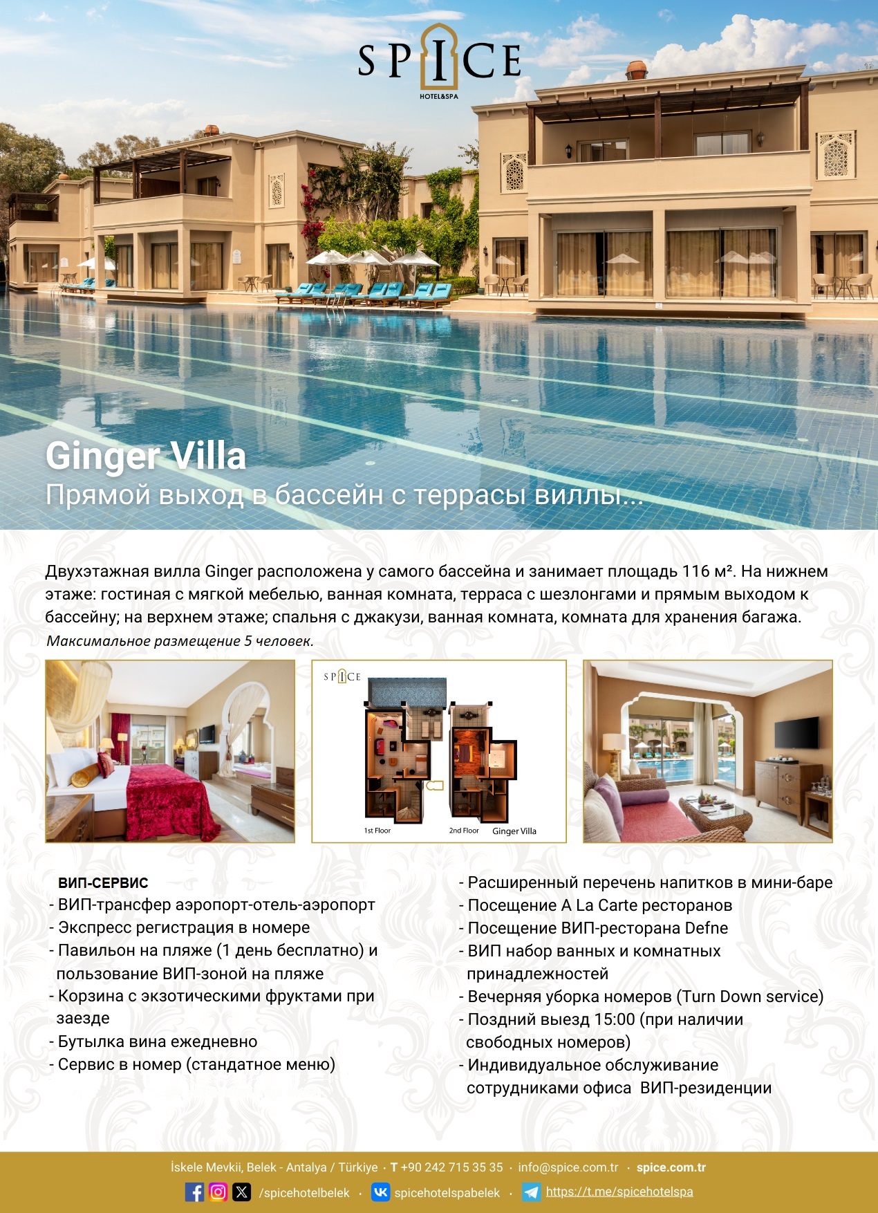 Ginger Villa - 116 м², макс. 5 чел. | на 1 этаже: гостиная, спальная зона, ванная, терраса; на 2 этаже: спальня с джакузи, ванная