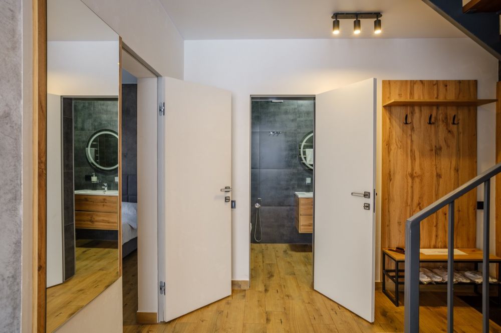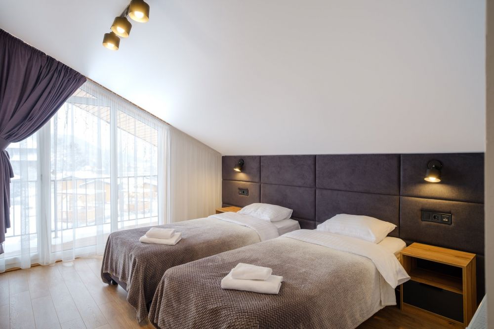 Апартаменты Люкс с видом на горы (корп. А) - 61 м², макс. 2-5 чел., вид на горы | 2 спальни (2 двуспальных кровати, 1 раскладной диван на 1 спальное место), кухня-гостиная, коридор, ванная комната с душевой кабиной