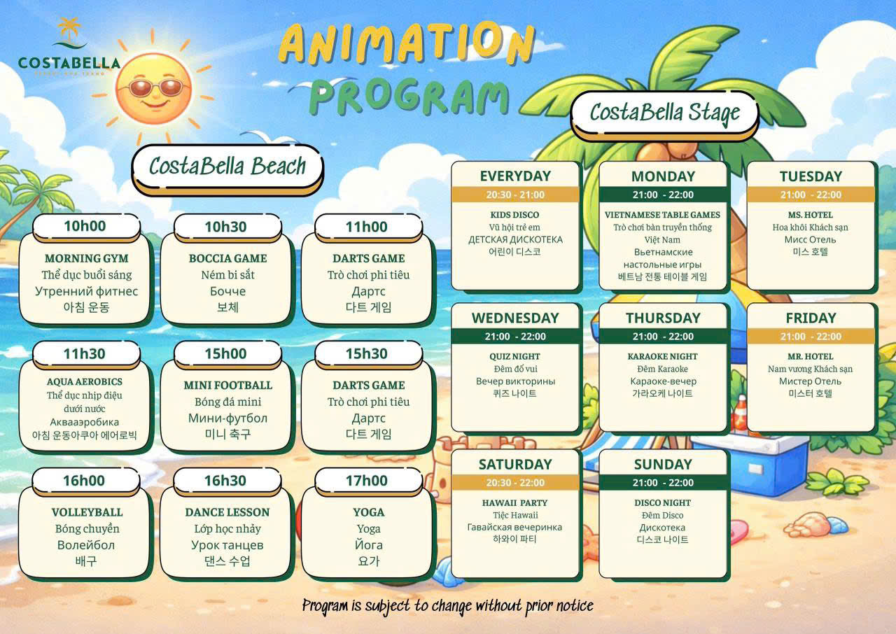 CostaBella Resort Nha Trang — курортный отель с тропической атмосферой, расположенный прямо на побережье Нячанга. Отель сочетает уединение, зелёную территорию и комфортный уровень сервиса, подходящий как для спокойного отдыха, так и для семейных поездок.